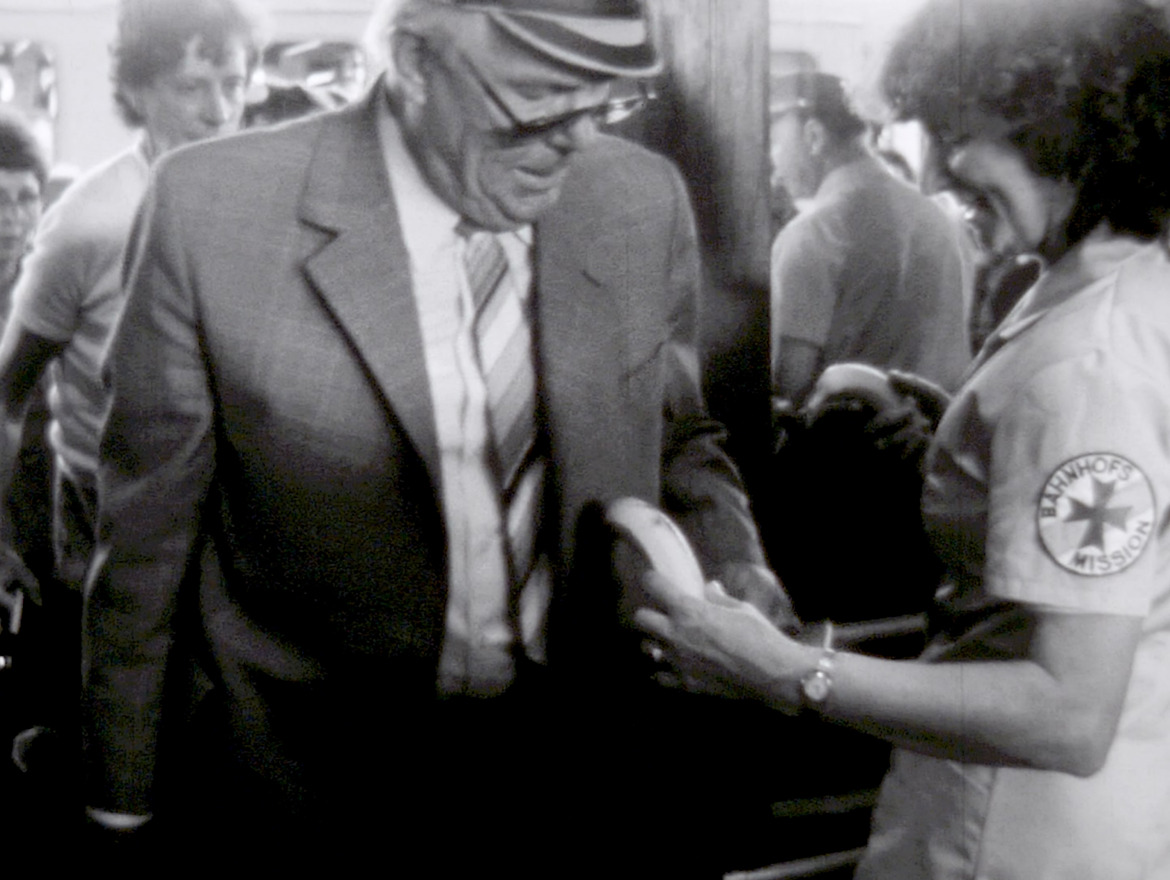 In 1988, Proll produced her graduation film, Der Zug aus Leipzig, in collaboration with Claudia Richards. In the film, the artists travel to the German-German border station at Büchen, where Proll interviewed East German pensioners who were allowed to cross the ideological divide from socialism to capitalism and back. As the train arrives at the station, the East-German travellers undergo border procedures, receive charitable food donations before continuing their journey to Hamburg. The film reflects on Proll’s own biography as an individual caught in-between political systems and nation states.