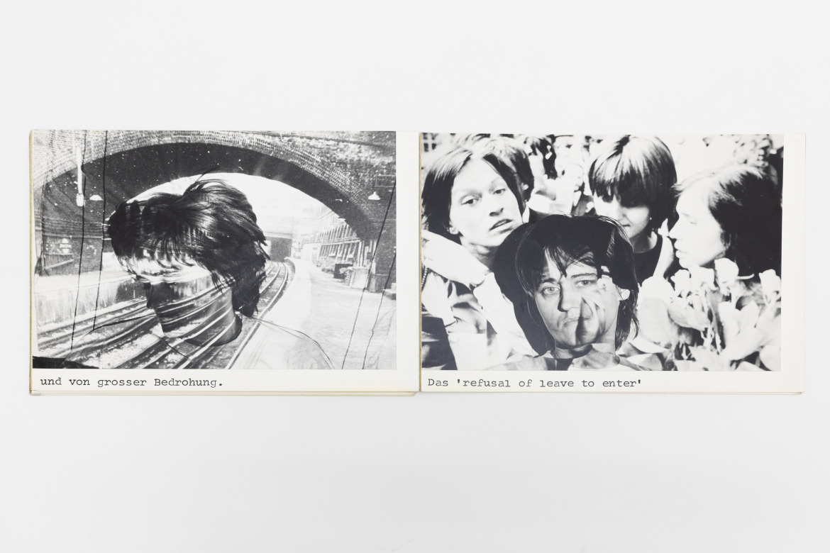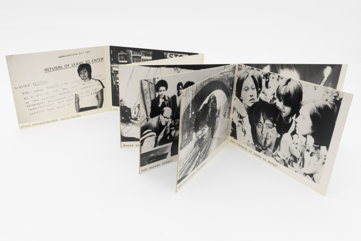 In 1981, Proll was extradited to Germany after previously being imprisoned and held in solitary confinement in Germany, escaping to London and living illegally under the alias Anna Puttick. Following her extradition, Proll did not need to finish her jail sentence for her participation in the RAF due to the severity of the previous solitary confinement. She returned to work with photography and submitted the exhibited leporello entitled Refusal of Leave to Enter as part of her application to film school. This never before shown work reads like a photo story, consisting of 11 self-portraits with images relating to her time in London, projected onto her body.