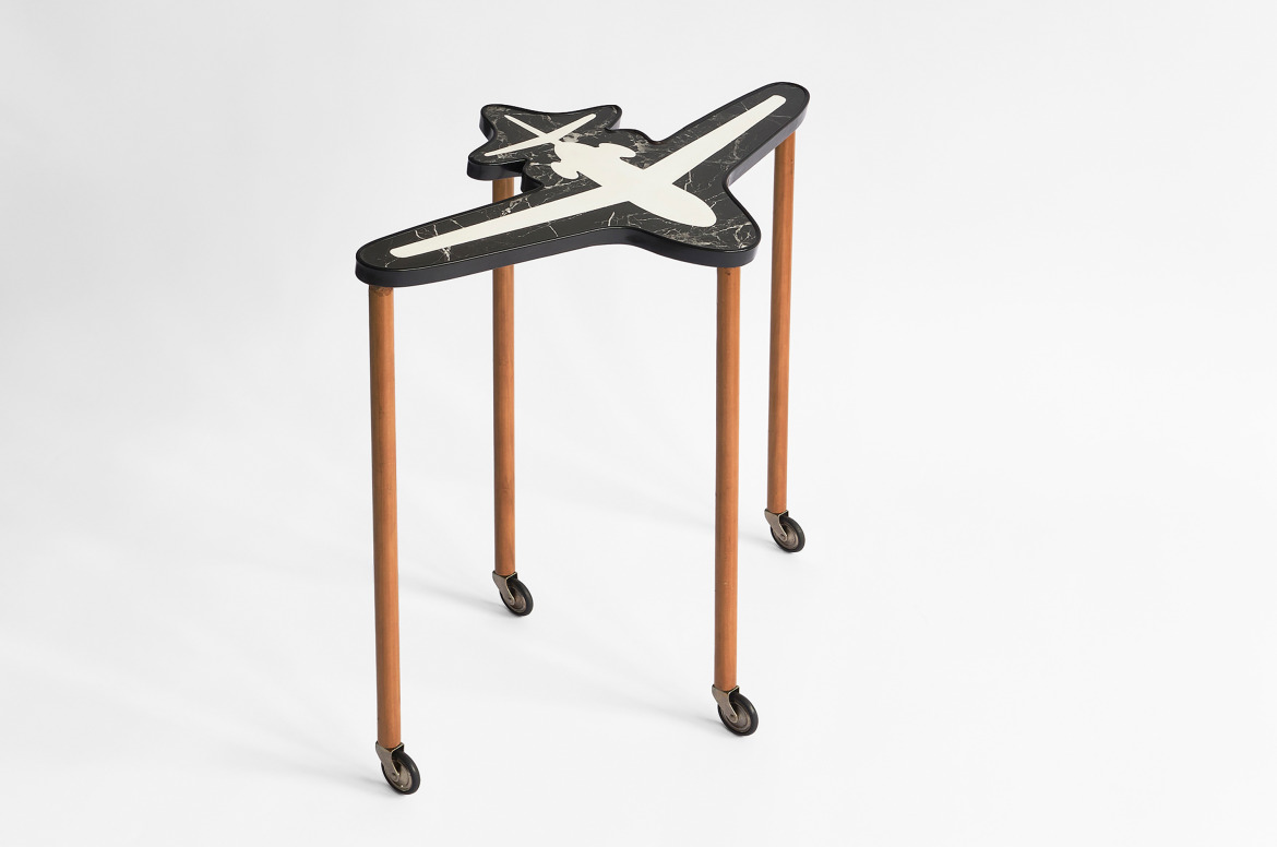 In 1982, Elke Denda created Flugzeugtisch, which she produced during her studies at the Kunstakademie Düsseldorf. This table-like yet dysfunctional movable object with a Formica top and a downward-sliding aeroplane breaks the boundaries between artwork and design object, and appears to be deeply influenced by Postmodernism. Denda started to develop a successful career in the arts but later withdrew from the art world to open a catering service and restaurant.