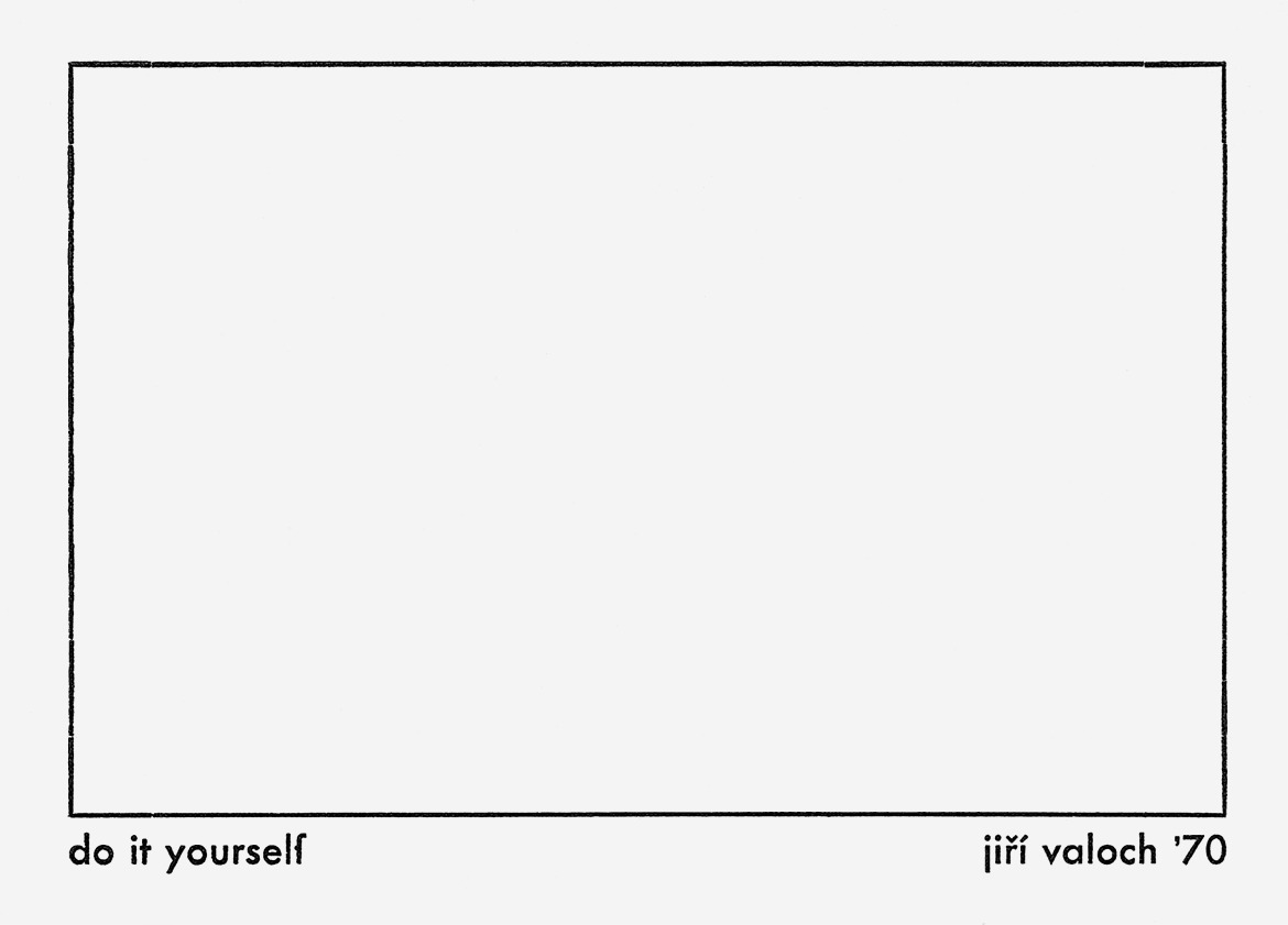 In 1970, the Czech conceptual artist Jiří Valoch sent a postcard entitled Do it yourself by mail across borders and countries. This simple gesture undermined existing censorship in Czechoslovakia and encouraged recipients to create their own artwork. On one hand political protest, the postcard enabled it’s recipient to develop their own creative ideas while Valoch himself was already barred from exhibiting in his home country. Do It Yourself is a frame within a frame, a blind mirror of personal self-reflection in the face of systemic silencing.