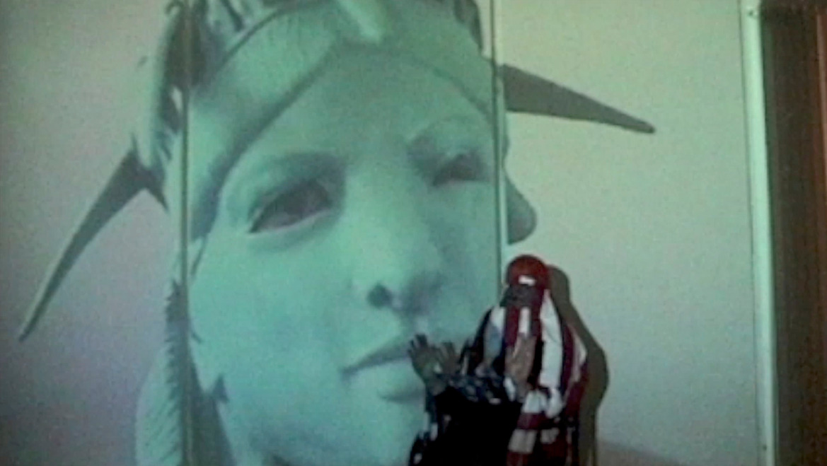In 2002, Kathe Burkart performed American Woman in front of a small audience. Dressed in a burqa made from an American flag, the artist sat on a chair and gestured to music while video footage of and around 9/11 was projected onto her. This radical performance, at a time when the War on Terror had just begun, is likely one of the first critical responses to US politics in response to 9/11. Here, it also marks the end of the exhibition and symbolised the end of the 20th century.