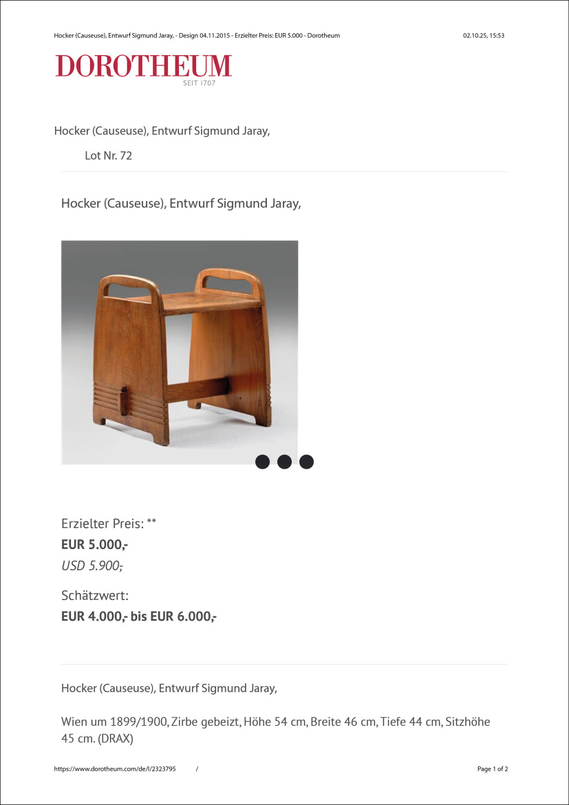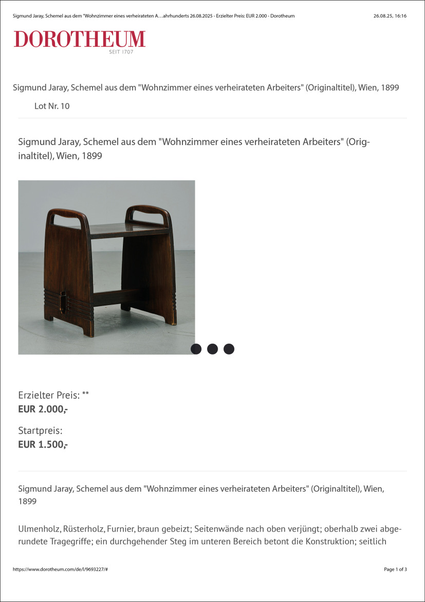In 1899, Sigmund Jaray, an ancestor of Tess Jaray, who was born in Vienna in 1937, won second prize for Wohnzimmer eines verheirateten Arbeiters, which is now in the MAK Museum’s collection. The Jaray family moved to Vienna to work on the construction of the Ringstrasse, as well as the 1873 Weltausstellung held in the Prater. Jaray’s award-winning room is an exception to the familiy company’s more conservative approach, with its subtle Art Nouveau lines and sense of lightness, yet it is based on the idea of improving the living conditions of the working class. Fast forward to 2015 and 2025: a stool from the aforementioned room was auctioned at the Dorotheum auction house in Vienna. A transitionary venue for a diverse range of goods, Dorotheum played a major role in the resale of looted Jewish goods under the Nazi regime; however, all relevant documents proving these allegations were lost at the end of the Second World War. The stool’s physical absence from the exhibition, and it’s representation through a simple PDF printout, highlights the transient nature of commodified goods and is a metaphor for the absence of the Jaray family from contemporary Austrian society.