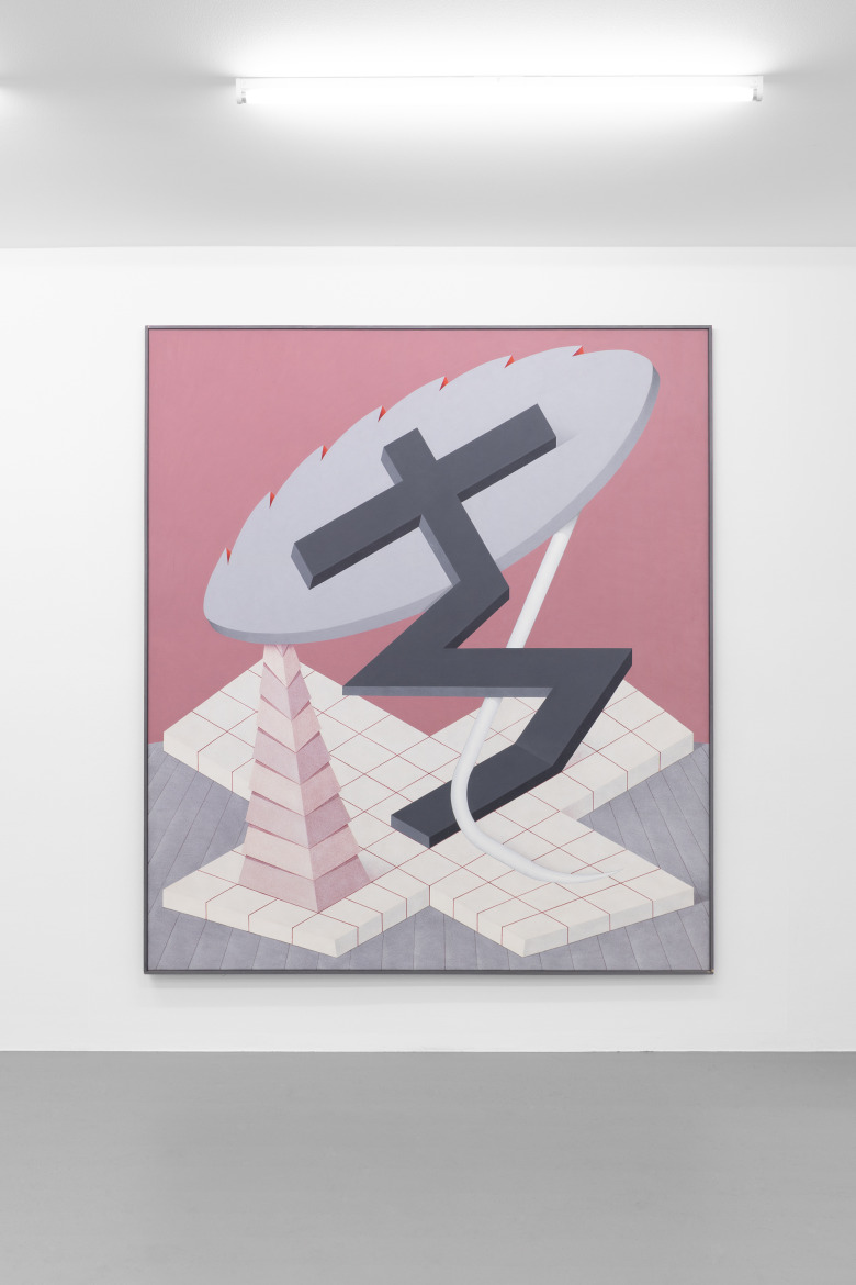 In 1989, the German painter Jobst Meyer created the exhibited work Konstruktion mit Kreuzscheibe und Haken. The date and arrangement of the objects make this work remarkable. A black, zigzag, cross-like shape, reminiscent of Rietveld’s 1932 chair, as well as Alchimia’s 1975 adaptation, sits atop a white-and-red, Superstudio-esque, checkered cross arranged with a pyramid-like form, a hook, and a circular saw blade. In the context of the year it was created, the painting could be interpreted as a visionary allegory of the looming consequences of the annexation of socialist East Germany by capitalist West Germany. The form, painted in a greyish black with the symbol of the cross, holds two identifiers of the ruling CDU party under German Chancellor Helmut Kohl, hooking the East with its commodified lure of freedom while using a saw blade to cut through the advances of West Germany’s socialist counterpart.