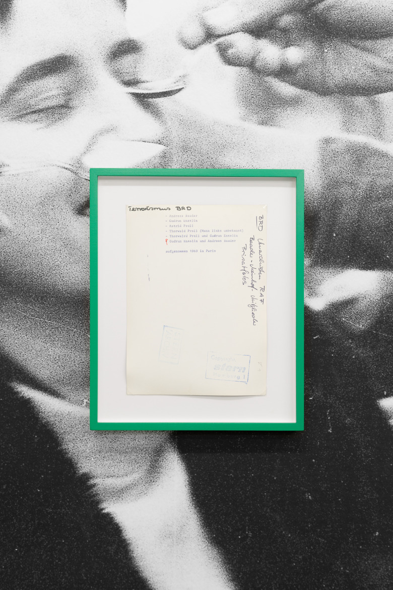 In 1967, Benno Ohnesorg was killed by German police during a student protest in Berlin. Inspired by the student movement of the time, Gudrun Ensslin and Andreas Baader concluded that more radical forms of protest were needed against the perceived post-fascist German state. Consequently, in 1968, they set fire to a shopping centre in Frankfurt, were caught by German police shortly thereafter, put on trial, and sentenced to three years in jail. During the appeal, they escaped to Paris with a group of supporters. Astrid Proll, a 22-year-old photography student at the time, joined the group on their escape to Paris, taking her Minox half-frame camera with her. Once in Paris, the group went to the famous Café de Flore, a popular hangout for intellectuals and artists, where Proll put the camera on the table. In an act of collective ownership, the camera was passed around and the group took the now famous photographs of each other. While the photos initially appear reminiscent of youth culture or fashion snaps, they would become the last private, pre-institutionalised images of the group members who, at this time, were forming the RAF (Red Army Faction), which created political upheaval in Germany in the 1970s and 1980s. Eventually the roll of film was sold off to Der Stern magazine that licensed these photographs, disregarding the photographers’ copyright. The exhibition shows an enlarged segment of a photo of Astrid Proll with the back side of a framed original photo from Der Stern magazine archive on top. The photograph itself is hidden, yet the labels and text on verso classify the depicted as ‘terrorists’ and ‘anarchists’.